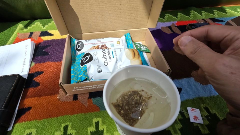 軽食が途中で出る。コカ茶orカモミール茶など、キヌアキャンディー、キヌアバー、キヌアビスケット。